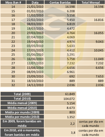 NT: Apesar da diminuição dos banidos nos últimos mass bans, 2010 acumulou uma quantidade maior de banimentos em relação a 2009. Veja o comparativo: