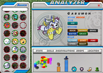 With analyzer you can check information such as status, skills, location and evolutions of Digimon unlocked through tasks.