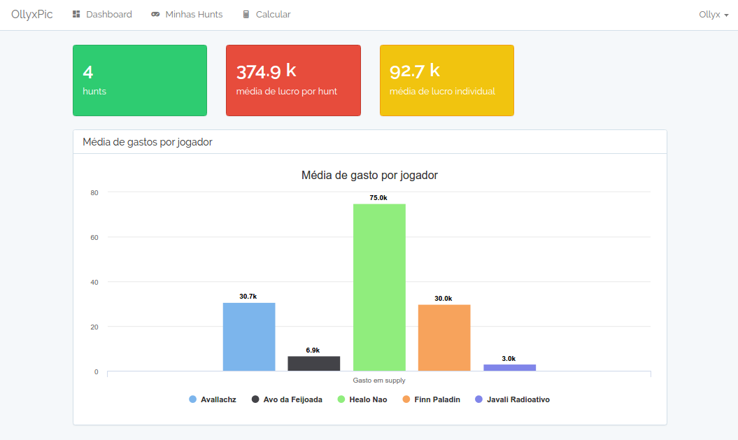 - Acesso ao dashboard onde poderá ver algumas estatísticas (hunts feitas, média de exp por hunt, média de profit por hunt, média de waste por hunt, média de profit individual) e também ao gráfico que mostra a média de waste de cada um dos players que caçam com você, possibilitando futuramente escolher amigos que gastem menos para fazer hunts em time.