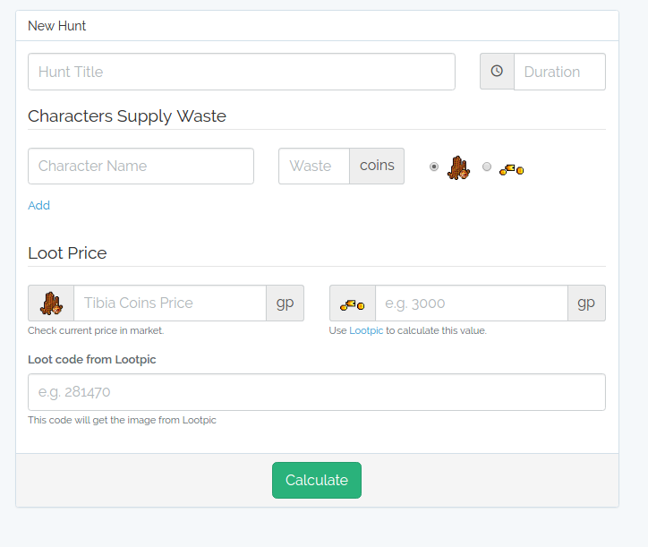 Na semana passada voltamos a jogar em Honbra e ai veio a necessidade de novamente calcular o Profit/Waste das hunts, porém como agora o Tibia tem a possibilidade de comprar potions por coins ficou um pouco mais complexo o calculo, já que tem que pegar a quantidade de coins e calcular baseado no preço atual dela no market e por ai vai, para resolver isso criei uma calculadora que faz tudo isso, você precisa apenas colocar os dados necessários.