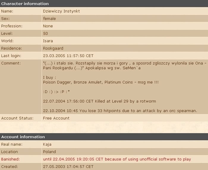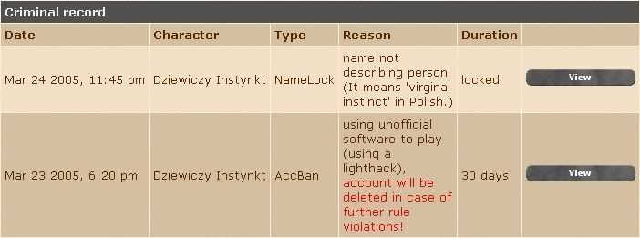Consequentemente o Gamemaster deu NameLock, pois "Dziewiczy Instynkt" significa "Instinto de Virgem" que não era legal pelas normas do jogo.