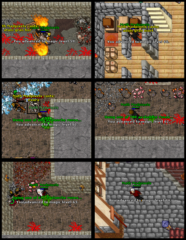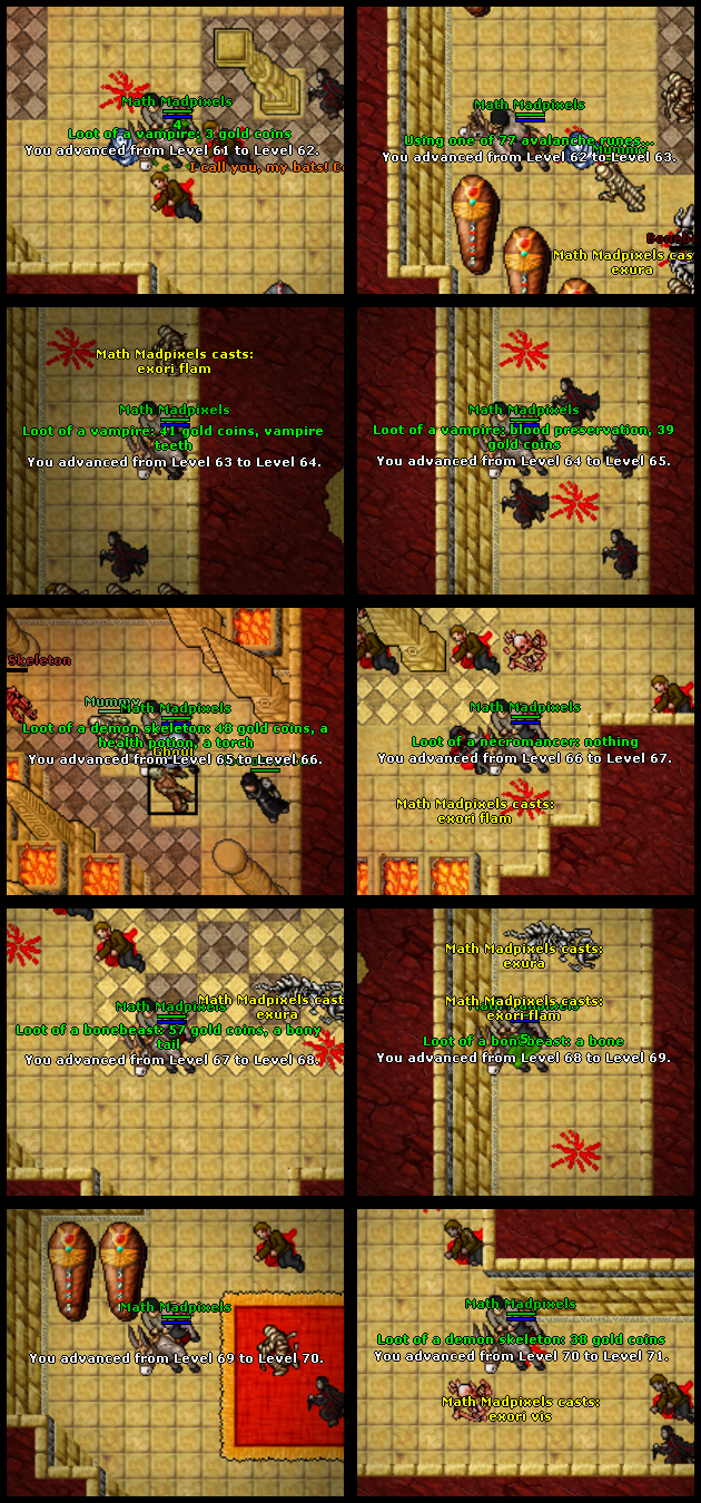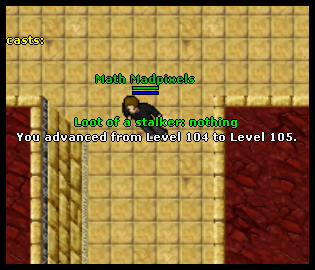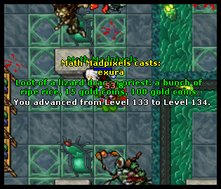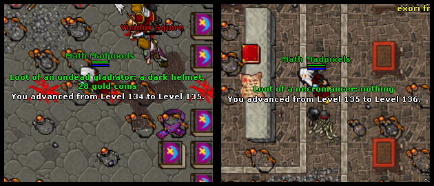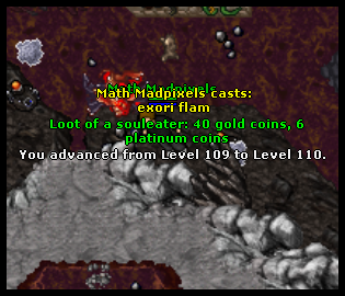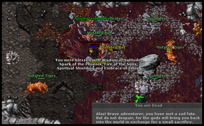Além da morte logo no primeiro dia que voltei, morri mais uma vez por besteira, foi no lv 136 chegando na hunt de Souleaters. Matei o primeiro resp depois da escada do PZ e fui trocar o exori frigo por exori flam na htk, quando terminei de arrumar voltei morto hahaha