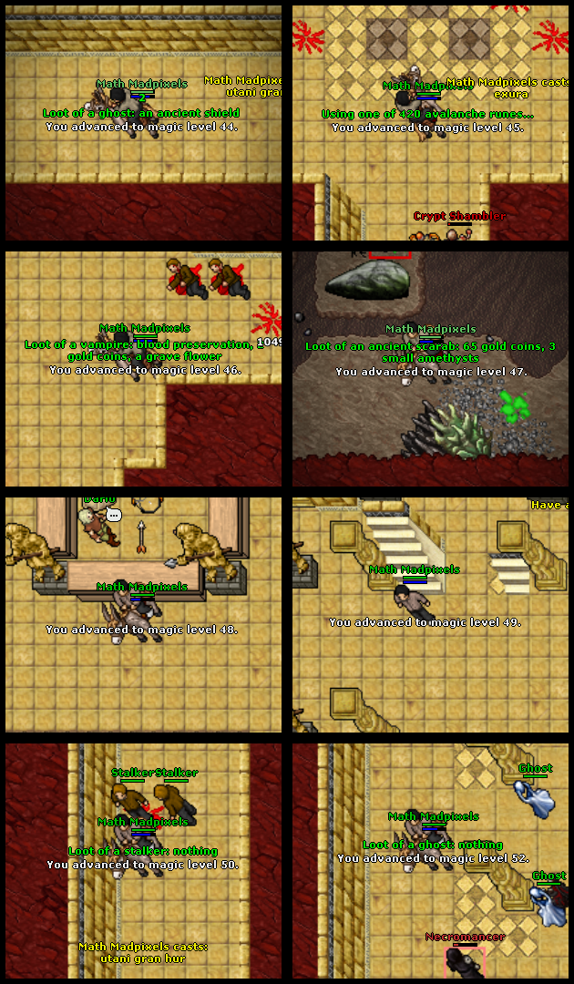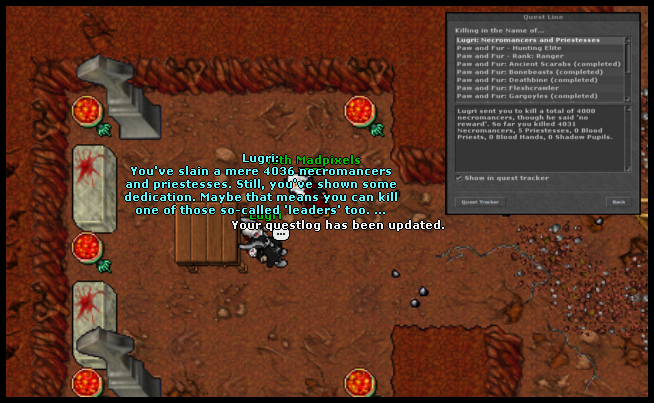 Com o tempo que eu estava sem jogar fiquei bem animado quando ativei a minha premium novamente e quando loguei fui com meu rl conhecer a Old Masonry, no death portal da Forgotten Knowledge Quest. Como eu já tinha matado quase 2k de Necromancers nas tumbas, meu objetivo era terminar a task o mais rapido possível (a wand do Mage Outfit é um dos meus addons preferidos).