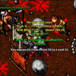 E peguei meu level 50 !!!!!!Fiquei Barbarian, em svargrond, tava sozinho no respawn, fiz 50k/h! Respawn tava muito bom.. Dexei faltando 5 de xp para upar (eu ia tirar fotos nos rats de thais :D~) mas nem rolo, cliquei com o char para ele ir para a rampa e mobo mt mammoth, dai: