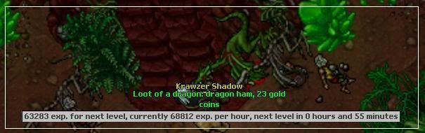 Foi pouco comparado o quanto eu fazia nos outros locais, mas a hunt é bem tranquila, rats dão bastante exp e não tomei waste, logo não tenho do que reclamar. Claro que itens de criatura não foram vendidos ainda, eu gosto de juntar bastante antes de vender...