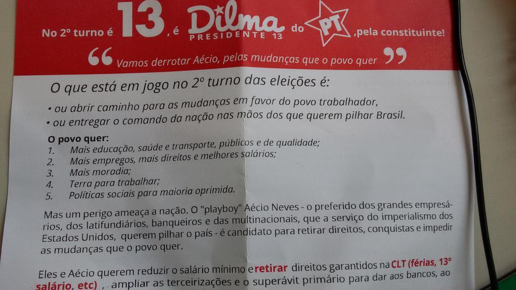 Olha o voto no segundo turno vai ser merda, tanto de uma lado como de outro, os eleitores deveriam ter levado outro candidato pro segundo turno e o único que tem pensamentos de uma evolução saudável para sociedade é o partido do Eduardo Jorge o PV, parece que as pessoas se esqueceram de várias coisas como, as manifestações de 2013, a super-faturação e elefantes brancos da copa do mundo, impostos altíssimos, custo Brasil, comprometimento do governo em dificultar as compras no exterior, saúde pública sucatiadas, estradas parecendo as da lua, dificuldade de estruturar um ensino mais eficiente no Brasil, a velha história das construtoras e empresas dominarem as licitações e doar dinheiro para partidos, falta de investimento em pesquisa cientifica e por aí vai.