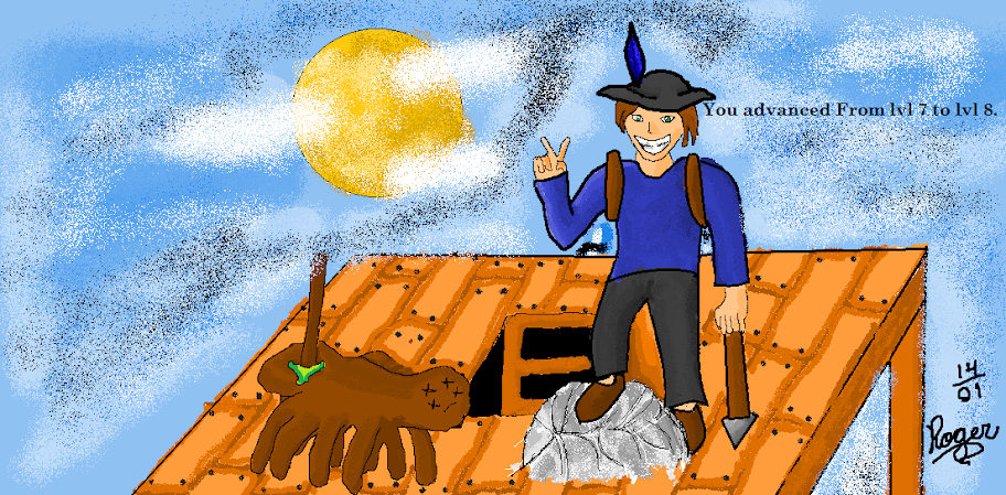 O do Rogin ficou bem bagunçado, e não se saiu muito bem com a ideia de fazer as nuvens com spray do paint.