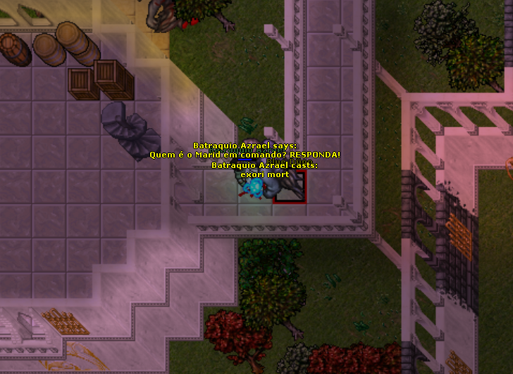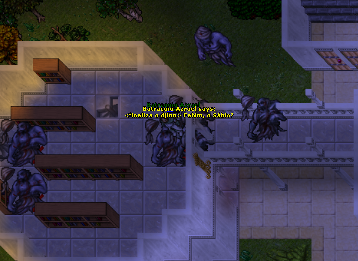 Utori mort! - Disse Batráquio, apontando a palma da mão esquerda para o djinn. Uma densa fumaça negra é lançada contra o ser, envolvendo-o, sufocando-o, prendendo-o."