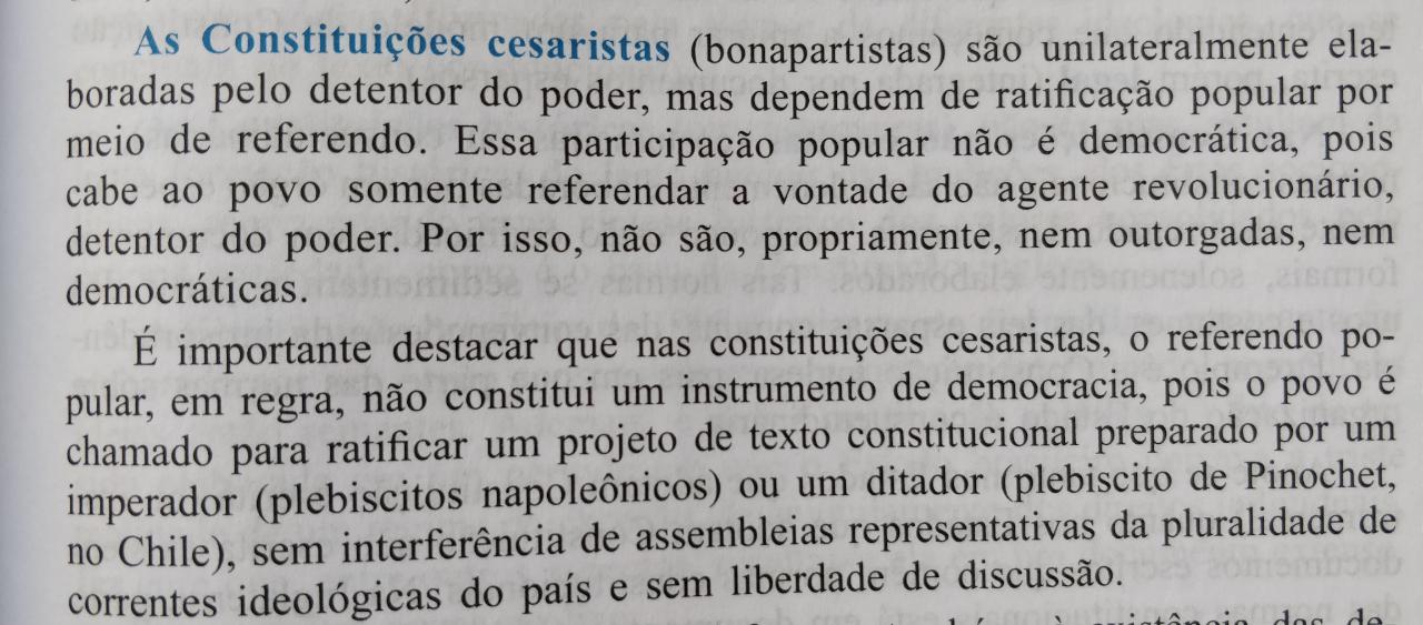 Não sou eu que digo que uma Constituição cesarista não é democrática, são estudiosos em consonância com a historia, é praticamente um consenso. Pelo que sei, toda constituição desse tipo foi feita por regimes não democráticos, usada como forma de dar legitimidade a uma CF outorgada(imposta).