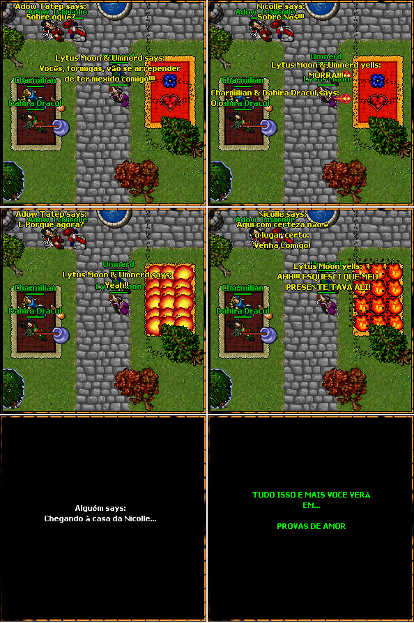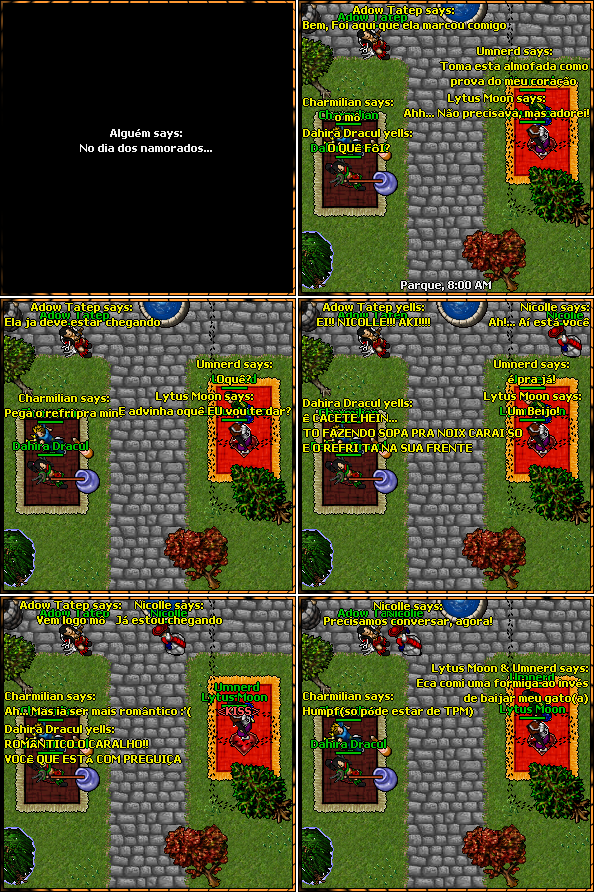 - Os cenários estão mal detalhados, como já disse. Você pode refazê-los adicionando alguns tufos de grama e pedrinhas em lugares estratégicos e também definindo melhor o ambiente. A ideia que você quis passar foi de uma praça, mas o ground de chão de rua não cai bem nessa situação.