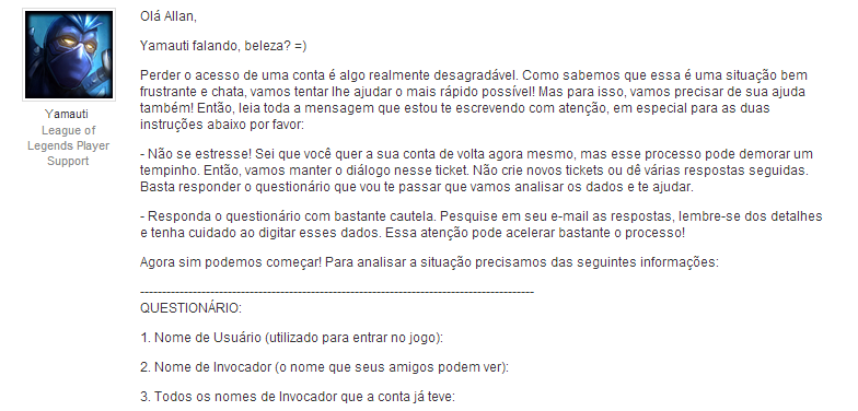 Basicamente vou ter que responder um questionário sobre informações da minha conta, e logicamente, sei de todas elas, mas que algumas foram difíceis, ô se foram, tiver que procurar aqui no HD da minha cabeça por uns 5 minutos.