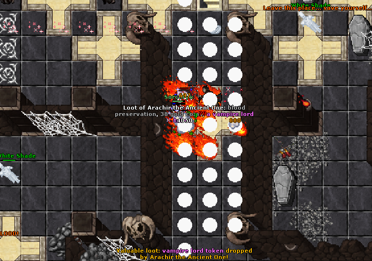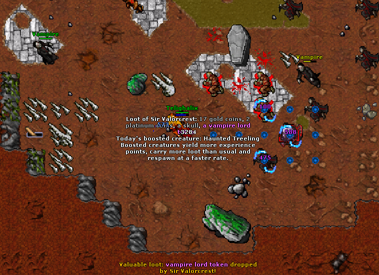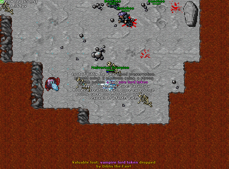 Falando em bosses, tive muita sorte e encontrei vários Vampire Lords, obviamente espalhados em diferentes mundos. Em Ombra os Vampire Lord Tokens valem 400k cada, ainda por cima o preço das TCs está muito baixo por lá (13k-14k cada), assim posso farmar algumas TCs e continuar renovando minha P.A sem gastar dinheiro real.