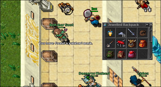 Vamos ao que interessa! Sábado e Domingo pra mim jogar é uma tristeza a mulher embaça pacas fiquei levando mijada por 30 minutos enquanto fazia a Yalahar KKK Foi tranquilo e o Guziito além de não pagar (assim como a maioria acho) :kkk: Trollou hardcore a quest puxou a parada antes dos caras decer ficou muita gente de fora. O importante é que deu tudo certo e peguei a mask pra vender!