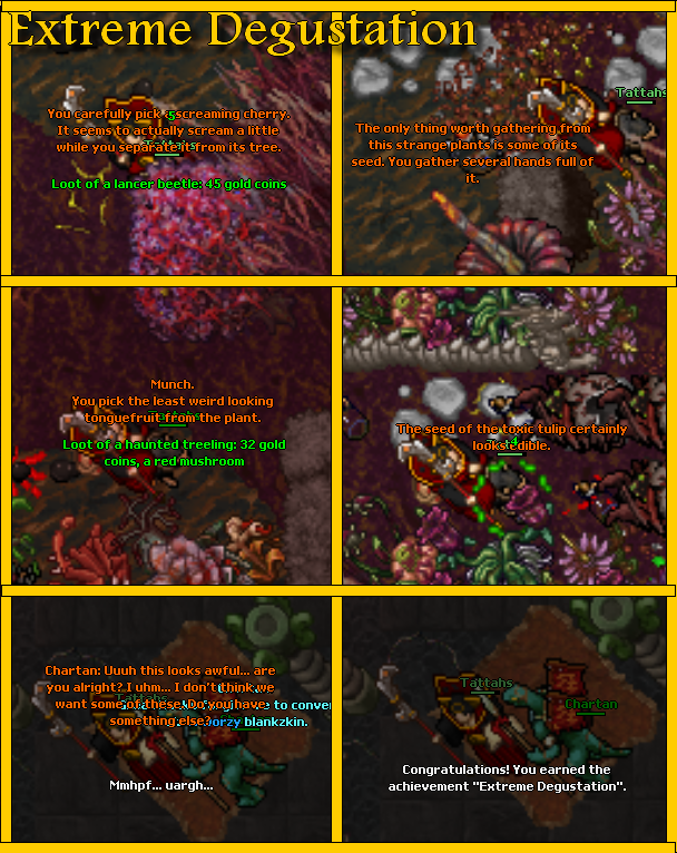 Uma mini questizinha que quase me matou, onde ja se viu colocarem tantos brimstone bugs, aquele inseto que desaparece, a aranha bunduda, lizards, arvorizinhas e sei la mais o quê num só lugar? Géezuis, as supplies acabando e eu lá tentando matar os bixos pra ir embora mas vinham mais e mais. T.T Desespero. Pra no final aquele lizard sem vergonha me fazer provar de coisa como por exemplo "semente de tulipa tóxica", ele não sabe interpretar nomes ou só queria me matar intoxicada mesmo. Bixo safadoo.