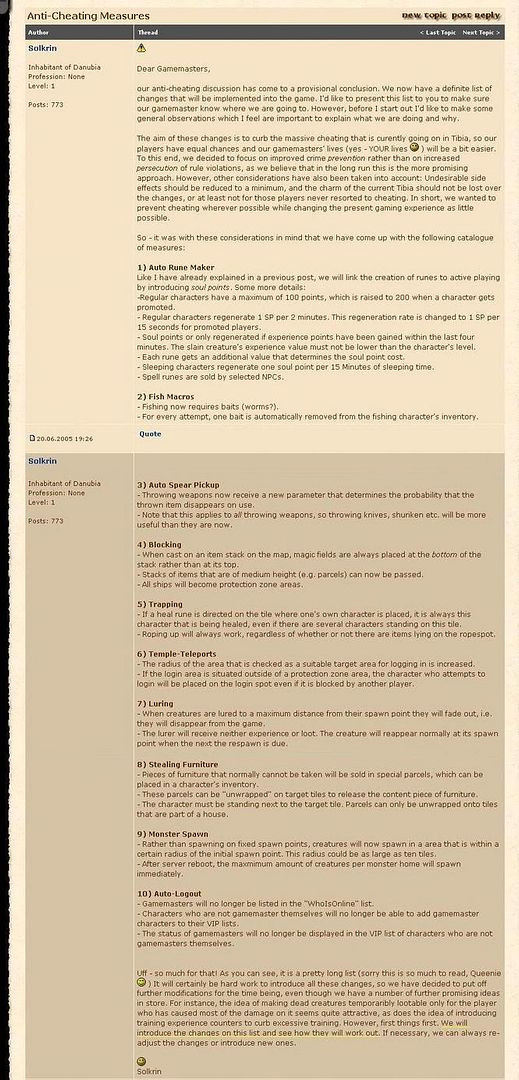 Em um jogo no qual mais de 100,000 jogadores fazem parte, existem sempre algumas maçãs estragadas que jogam de maneira injusta e destroem a diversão dos outros. Por exemplo, alguns jogadores tentam ganhar uma vantagem desleal usando softwares não-oficiais, enquanto outros abusam de fraquezas do jogo para fazer a vida de seus companheiros Tibianos miserável. Para igualar as chances para todos os jogadores, nós iremos incluir um novo sistema anti-cheat no próximo update.