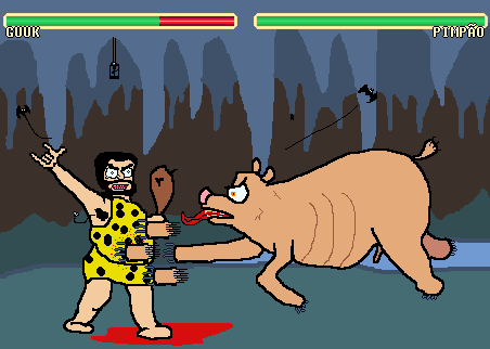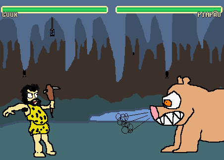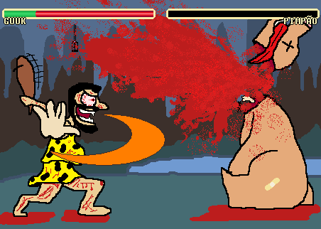 Voltando ao que interessa, o tapa estomacal começou a enfurecer Guuk sobremaneira e esse resolveu usar a estratégia do BERSERK-MODE. O barbado Guuk começou a apanhar de propósito. Se alguém visse, apostaria que o Urso estava levando a melhor. Nosso herói deixou o ursão bobo gostar da briga. Ficava cutucando o urso com sua clava e fazendo sons irritantes, tipo "hi hi hi, piuí piuí e glugluglu". Pimpão partia pra cima com tudo, como se brincasse com sua comida. Estava alegre e feliz, mas quando percebeu seu erro, já era tarde. Um movimento errado do empolgado Pimpão e Guuk, numa explosão indescritível de adrenalina, ódio e fome de sangue desferiu-lhe um único golpe certeiro que lhe explodiu o pescoço, pondo um ponto final sangrento à sua existência.