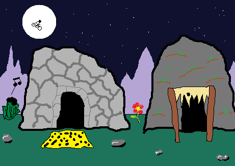 Guuk, esfomeado, comeu as 67 bananas restantes (ver seu bucho grande e sempre forrado) e teve uma dor de barriga das mais violentas. Na foto pré histórica, vemos as moradas dos dois. Dá pra deduzir quem mora em qual. Atrás de uma moita próxima, Podemos ver Guuk se despedindo das bananas, entoando um assobio melancólico. Foi nesse exato momento que o homem inventou a ação de cantar no banheiro, hoje mais usada durante o momento do banho.