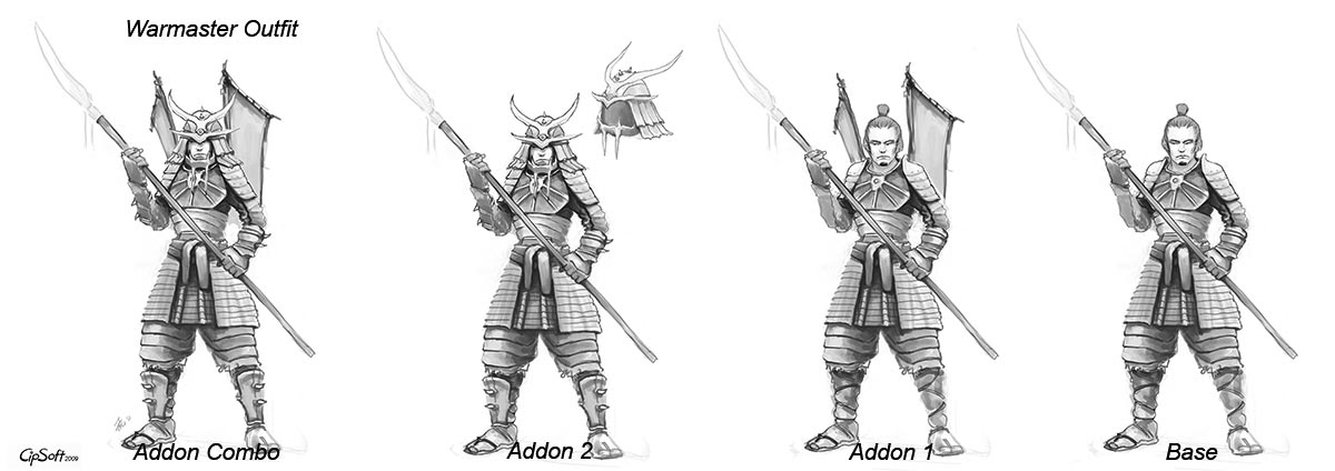 Em Zao, personagens podem ganhar o direito de usar uma nova roupa. Tanto o tema geral do update como o sistema de guerras inspiraram Jan a desenhar uma impressionante roupa de warmaster (mestre da guerra): "Eu queria aproveitar a oportunidade para criar algo que caísse bem com isso, algo para ir à guerra, que parecesse legal em uma batalha épica. Eu amo essas cenas de batalhas imensas, na qual exércitos de guerreiros bem equipados, com pequenos estandartes em suas costas, avançam um em direção ao outro, alguns se chocando com outros ferozmente, outros formando uma disciplinada falange com suas naginatas, ordem em meio a todo esse selvagem caos, sem medo... glória!" Parece que o tema Samurai foi uma escolha fácil.