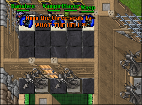 Use o Energy Disc na máquina e ela vai ligar. Entre no teleporte e você estará de volta bem a frente da entrada da sala dos quadros. Agora a porta abre e você pode entrar. Pode pisar no fogo azul, não acontece nada. Agora você deverá usar os 3 selos, 1 em cada quadro, MAS ATENÇÃO, logo que você usar seu ultimo selo e ele falhar igual aos outros 2, serão sumonados na sala 1 banshee, 1 vamp e 1 wasp. Então se prepare antes de usar o ultimo selo. Você pode escolher matá-los agora ou correr pra fora da sala, mas é inútil, pois você terá que voltar aqui e matar eles de qualquer jeito.