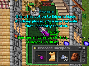 Fale com ele denovo, pedindo por mission. Dessa vez ele vai lhe pedir para que entregue um novo tipo de poção que ele criou para a academia de magia em Edron. Diga yes e você vai receber a Eclesius’s Potion, que se parece muito com uma Mana Potion comum, porém não dá para usar e pesa um pouco mais.