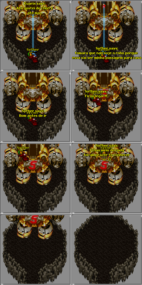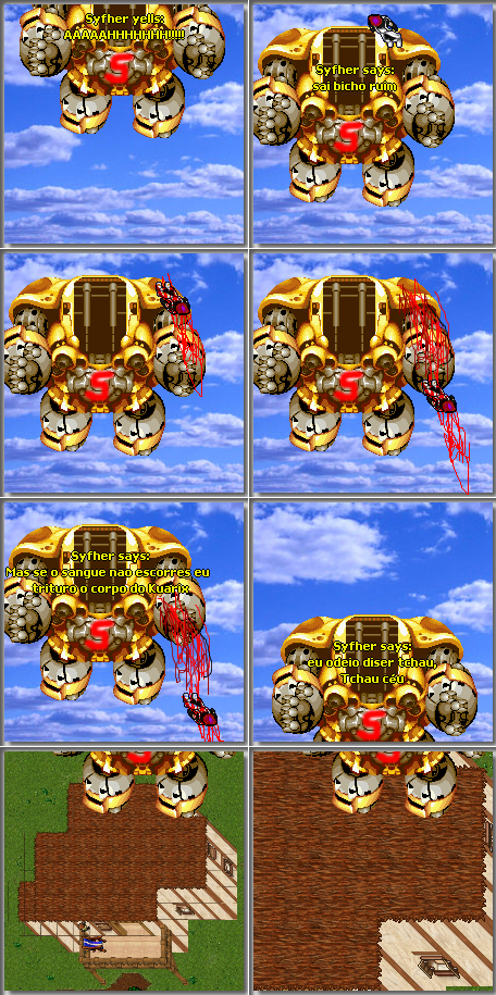 Esse sangue mal feito todo riscado do paint, e o mijo também, e cara o que aconteceu quado tu voou com o robô? O kuarix apareceu em zumbi pra te matar? Ok, não foi isso, mas não entendi, desculpa.. T_T