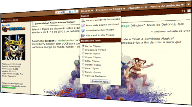 Elfo: Quando me cadastrei no fórum eu era um frequentador assíduo da subseção [boardtibiabr="16"]Rookgaard[/boardtibiabr], até que um dia "El Chefón" [USER="2178"]LockeChereCole[/USER] decidiu abandonar o Tibia e o fórum, indicando-me para ser seu sucessor. Em Agosto de 2006 virei Sub-Moderador de [boardtibiabr="16"]Rookgaard[/boardtibiabr]. Por algum tempo continuei cuidando exclusivamente de lá, mas logo fiquei responsável por toda a seção [boardtibiabr="49"]Cidades[/boardtibiabr]. Até que no mês de Setembro de 2009 recebi por MP o convite do [USER="1"]Admin TibiaBR[/USER] para ser Moderador e cá estou até hoje.
