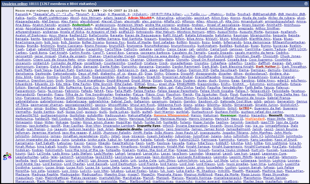 Você pode reconhecer um sub-moderador nesta imagem pela cor vinho. Os moderadores que hoje são representados pela cor azul, antigamente eram na cor preta. Nesse dia o fórum bateu o recorde de usuários online (era dia de update).