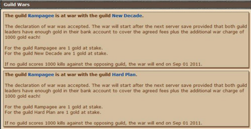 Bom como jogo a muito tempo, vou resumir minha historia para o meu tempo em Amera: Eu estava parado quando meus rls pediram minha ajuda aqui, falando que estavam perdendo a war e o time estava desanimado, então eu e alguns amigos voltamos a jogar pela war =P , após alguns meses consegui vencer a minha primeira war em Amera (Mind Astray vs Indecisive), depois disso dessa o servidor teve 1 pequeno tempo de paz (paz para min era igual DotA porque eu só jogava para war), seguido por otra war (Mind Astray vs Hard Plan) essa war foi um pouco chata, os caras eram persistentes e alguns acontecimentos foram rolando e deixando a war mais tardia, alguns gringos entraram na war que ficou (Mind Astray vs Hard Plan + New Decade) mesmo com as 2 guilds juntas nos continuávamos ganhando as battles, ate que como ultimo recurso eles finalmente aceitaram Warmode, só que como em todas as guilds alguns membros do nosso time não queriam aceitar o Warmode, então criamos a rampagee e ficou assim: