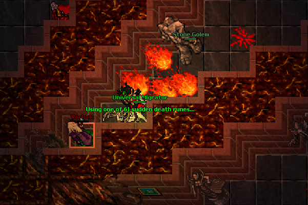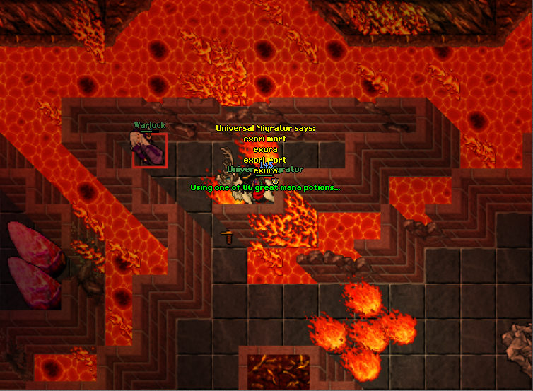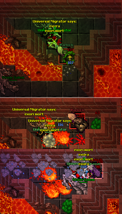 Pode perceber que logo na subida há uma grande chance de já topar com 2 warlocks, e é nessas horas que você vai usar SDs se você veio no Exori Mort. Tente arrastar um para o canto > do lado da escada e mate lá, ou simplesmente descarregue SD e deixe ele correr enquanto mata os outros. É recomendado o uso de Energy Ring quando vier mais de um, eu lvl 100 caçando ali conseguia healar dois me batendo, mas era exura vita atrás de exura vita. Se vierem 3 ou você for +- lvl 80 use ring.