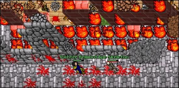 Richter Belmont usando uma Vampire Killer, versão aprimorada de Morning Star, com uma throwing Knife e matando um Ape Skeleton.